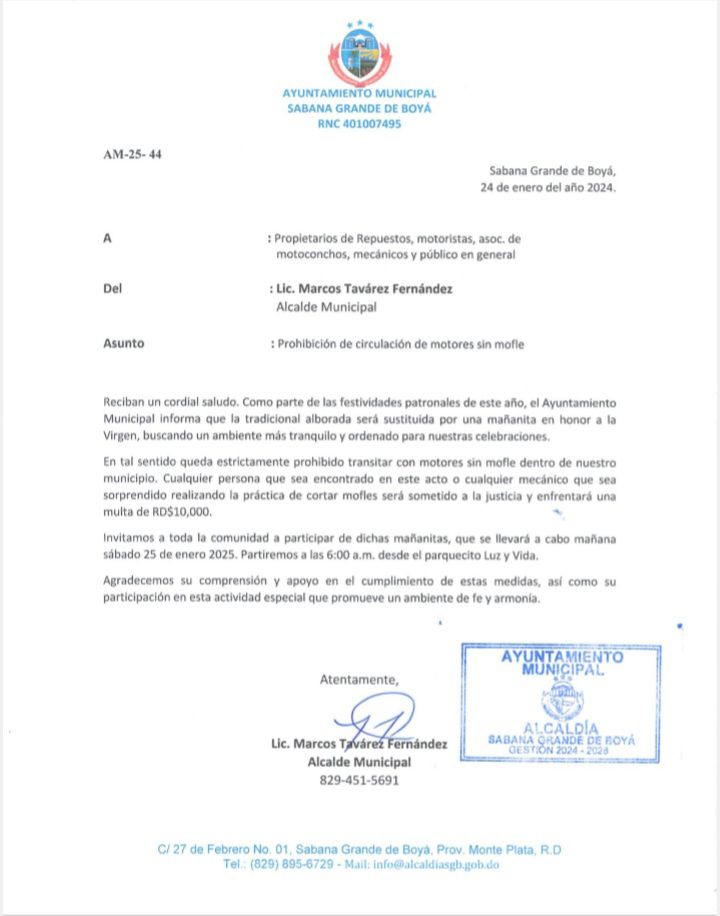 El Ayuntamiento Municipal de Sabana Grande de Boyá informa que, como parte de las festividades patronales, queda estrictamente prohibida la circulación de motores sin mofles dentro del municipio. Esta medida busca garantizar un ambiente tranquilo, ordenado y respetuoso durante las celebraciones en honor a la Virgen.
