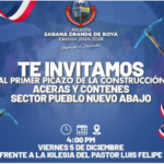 La Alcaldía Municipal de Sabana Grande de Boyá, tiene el honor de invitar a toda la comunidad, al primer picazo para la construcción de aceras y contenes en el sector Pueblo Nuevo Abajo, una obra que marca el inicio de importantes transformaciones en beneficio de nuestros ciudadanos.