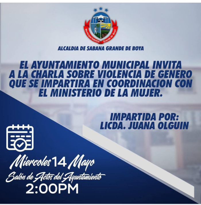 El ayuntamiento Municipal te invita a la charla sobre la violencia de género que se impartirá en coordinación con el ministerio de la mujer este miércoles catorce de mayo a las 2:00 PM en el salón de reuniones del palacio Municipal.